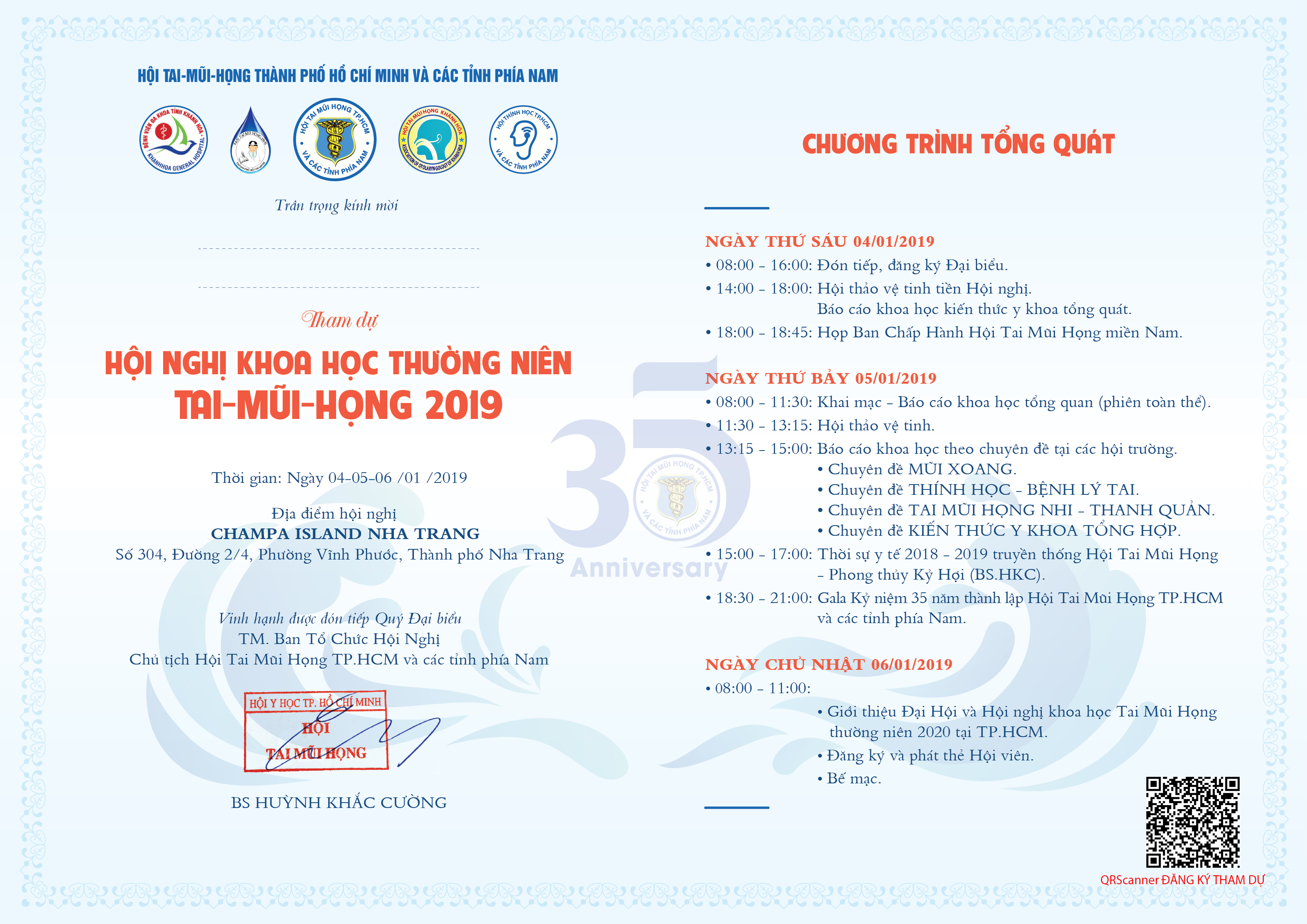 Hội Nghị Khoa Học Tai-Mũi-Họng Thường Niên 2019 mừng Tết Kỷ Hợi được Hội Tai Mũi Họng phối hợp cùng Bệnh viện Đa Khoa Tỉnh Khánh Hòa, Hội Tai Mũi Họng Tỉnh Khánh Hòa tổ chức tại TP Nha Trang - TP biển hiện đại, hòn ngọc của Biển Đông, với khí hậu trong lành với nhiều di tích lịch sử từ ngày 4-5-6 tháng 01 năm 2019